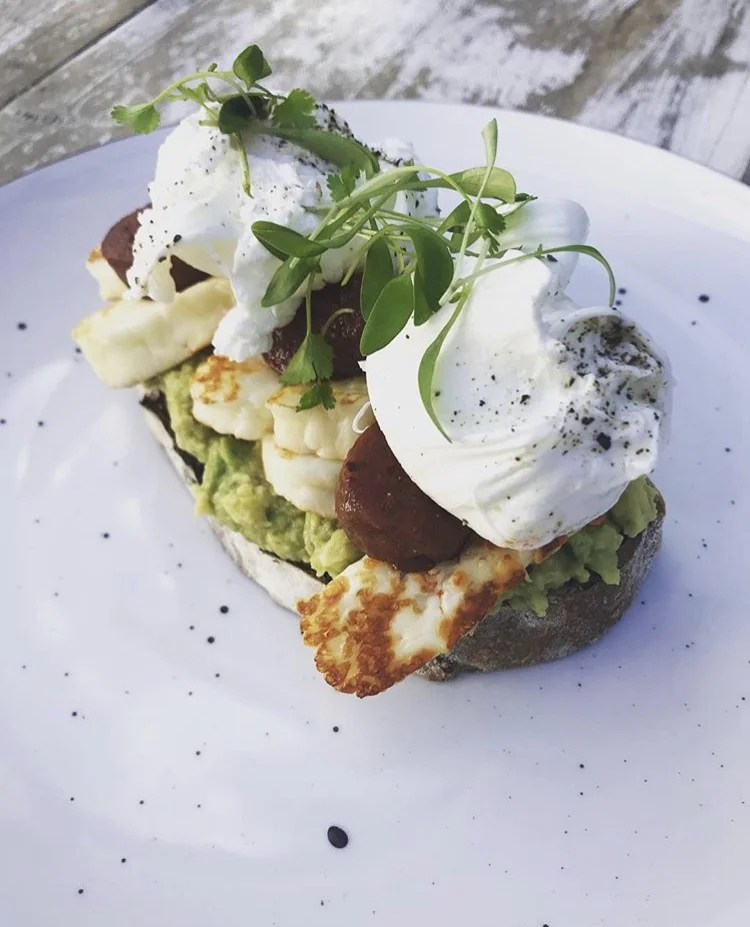 Avocado on toast with halloumi, chorizo and poached duck egg